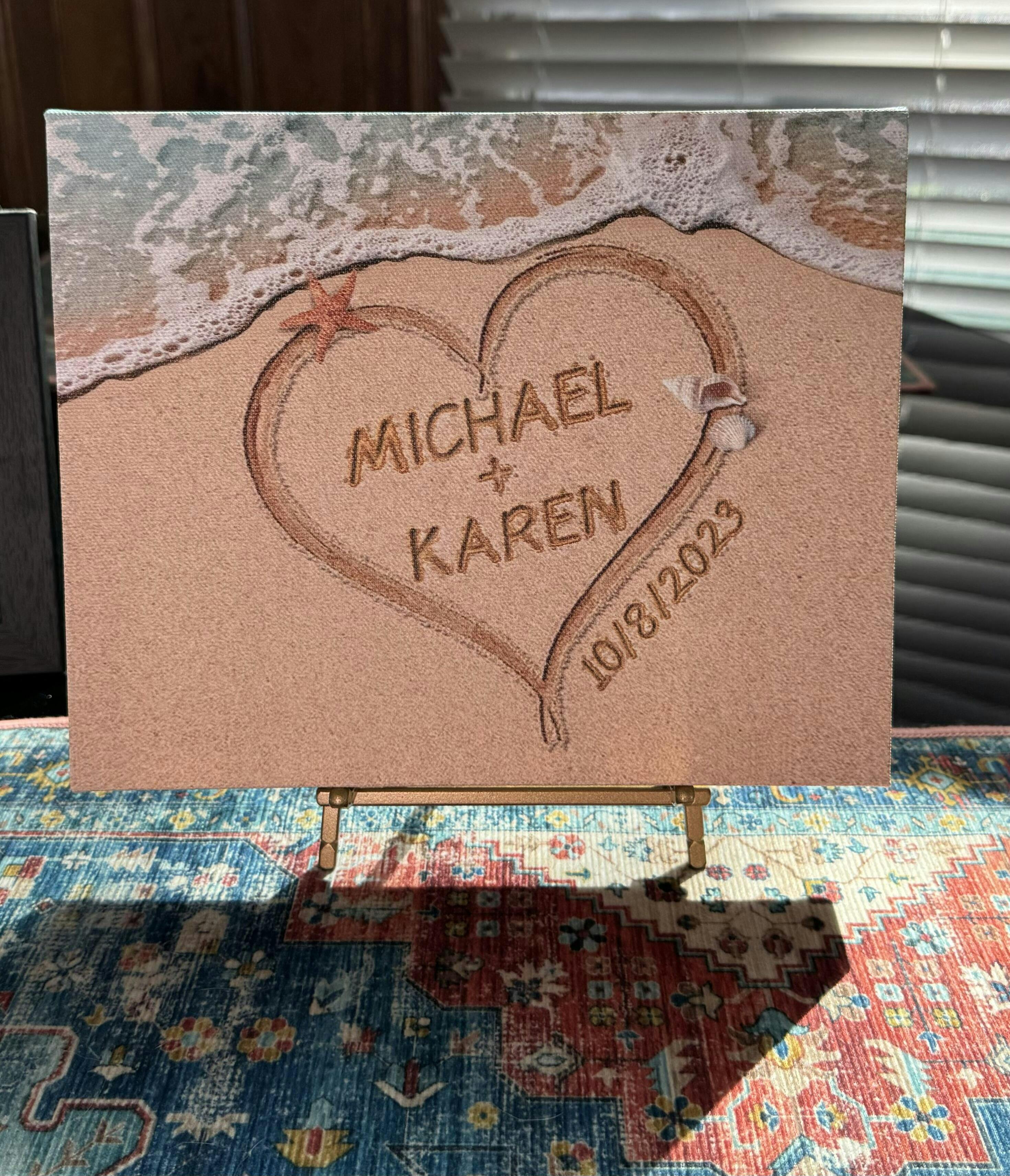 This custom heart in sand with couples names is the perfect way to celebrate your love story.