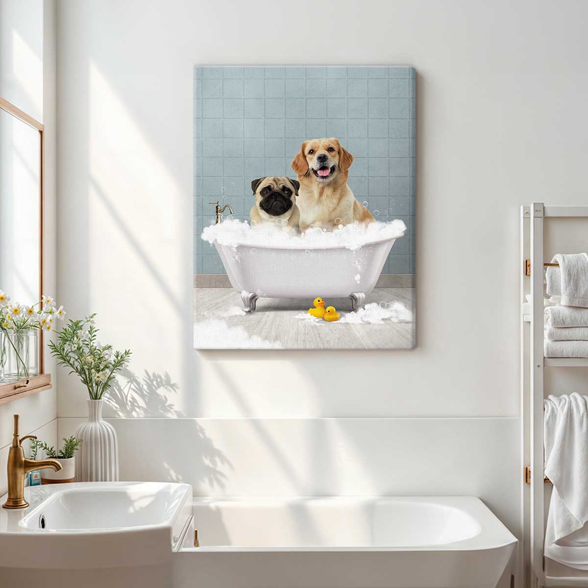 Transform your bathroom into a sanctuary of joy and humor with our Custom Pet Portrait featuring two adorable dogs enjoying a bubbly bath! This unique piece of art not only adds a playful touch to your space but also celebrates the special bond you share with your furry friends.