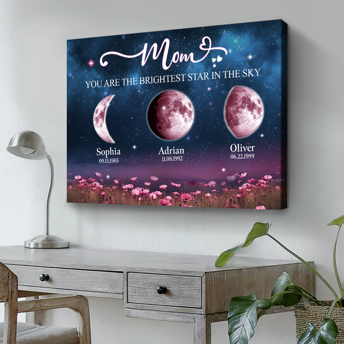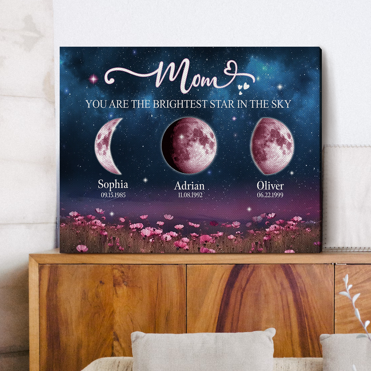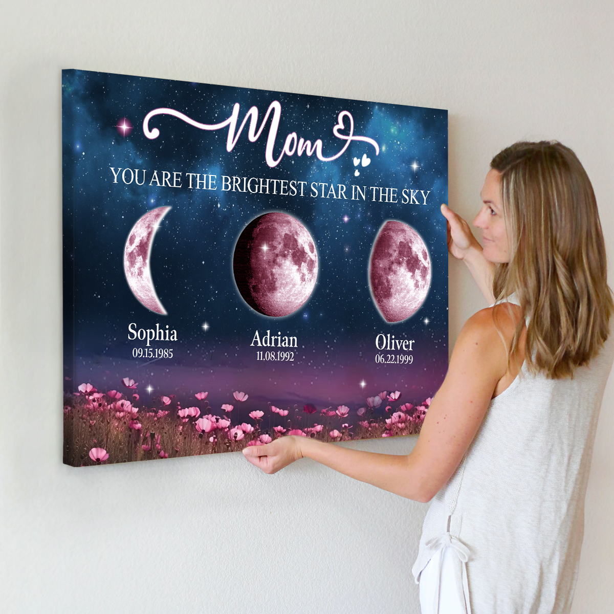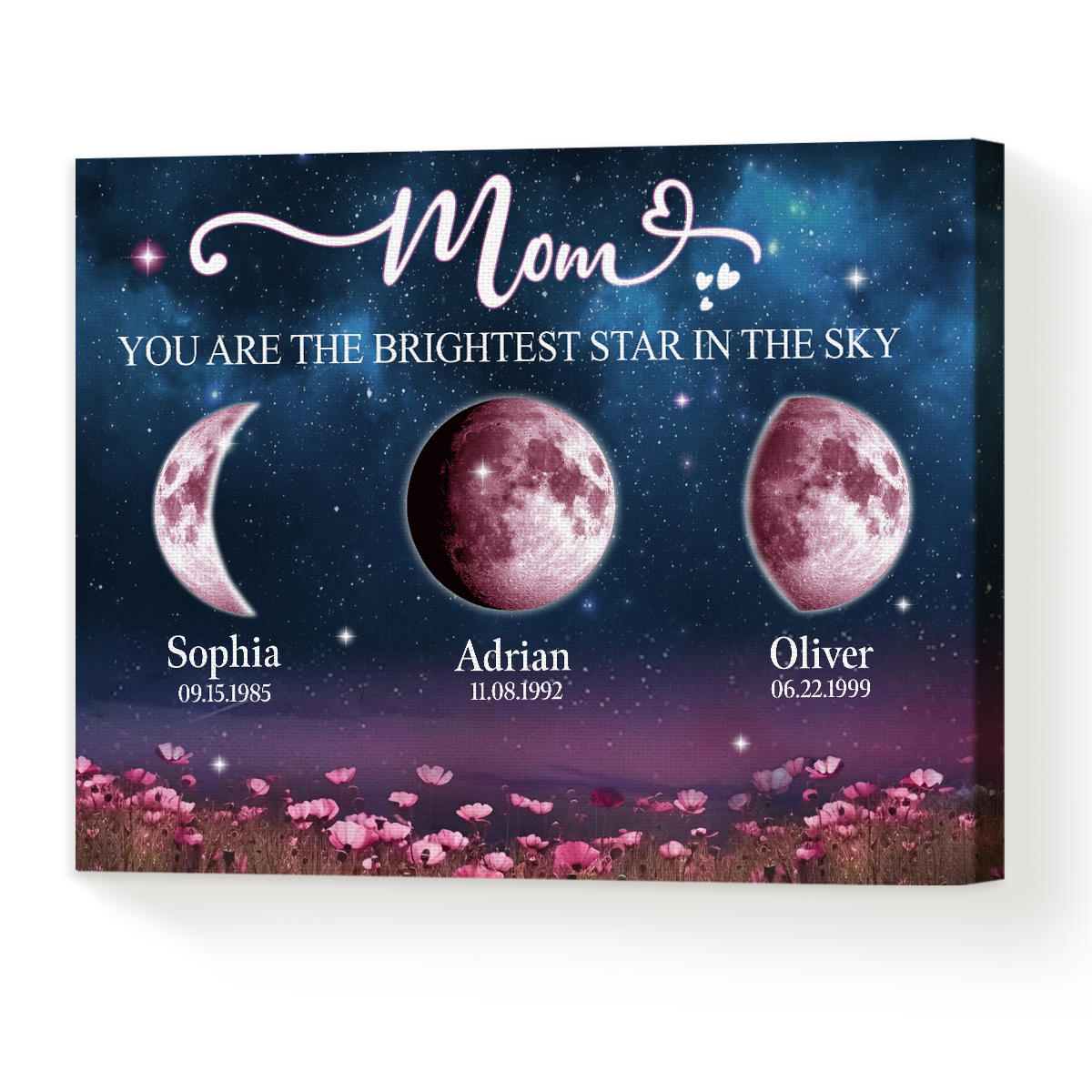 A Personalized Moon Phase on Canvas is more than just wall art — it’s a celestial keepsake that captures the beauty of the night sky from the moments that matter most. Each moon phase represents a child’s birth date, beautifully aligned with their name, making it a touching reminder of the special bond between a mother and her children.