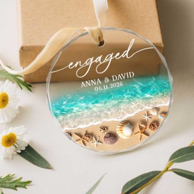 Personalized Beach Engaged Glass Ornament – Newly Engaged Gift, Custom Couple Name and Special Date Keepsake, Engagement Christmas Ornament